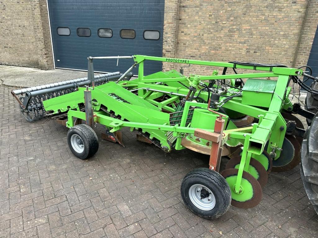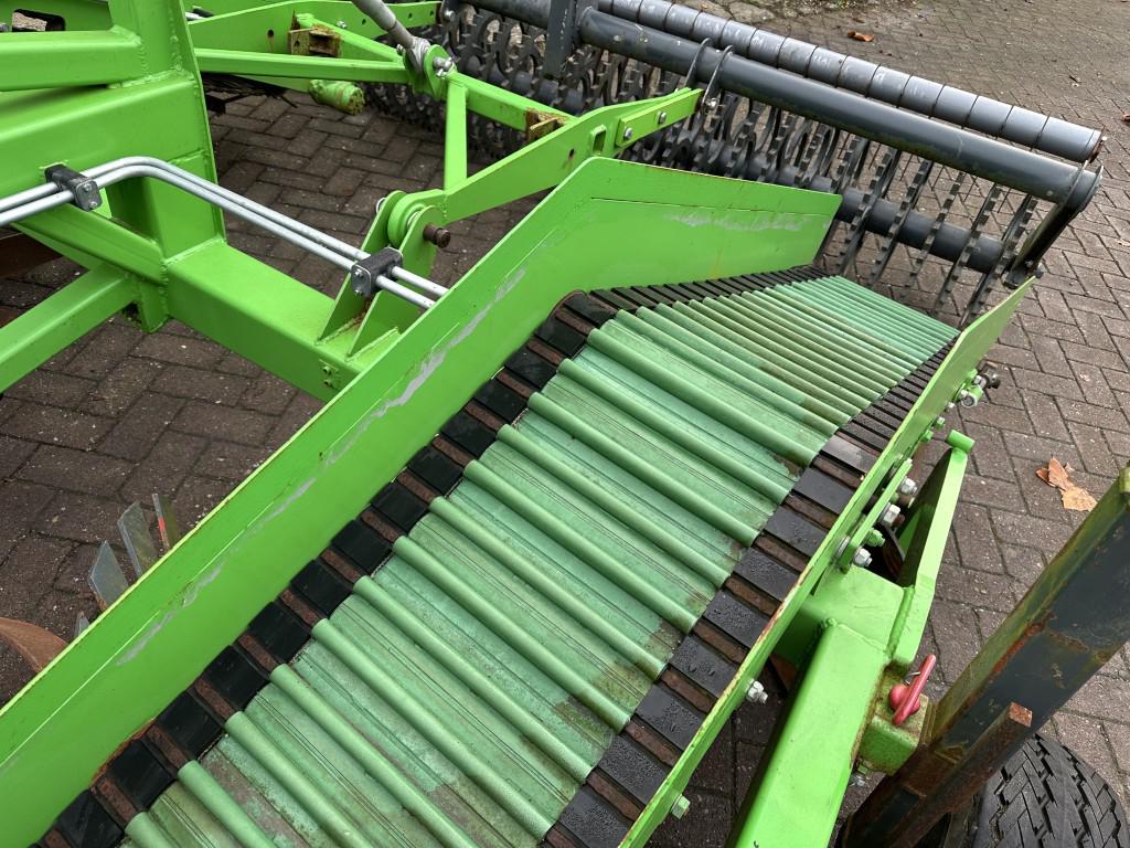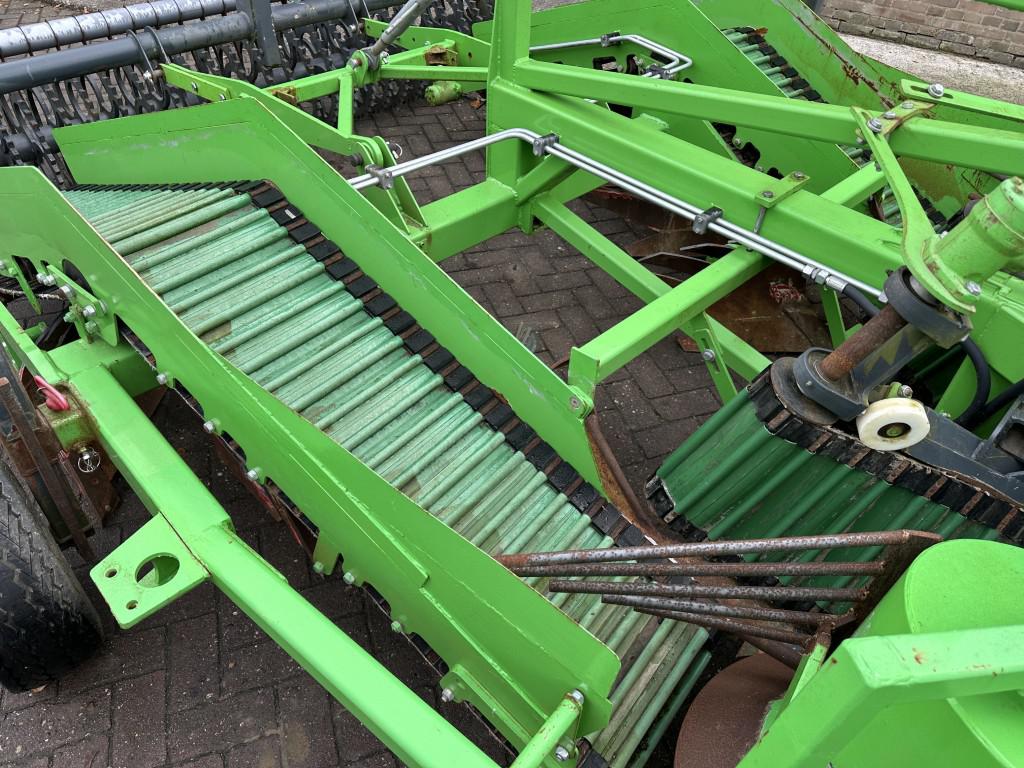 Middenachter de trekker nemen twee scharen twee repen grond op, waarna die met hulp van draaiende trommels op transportbandjes worden gelegd en naar achteren en naar buiten worden getransporteerd.