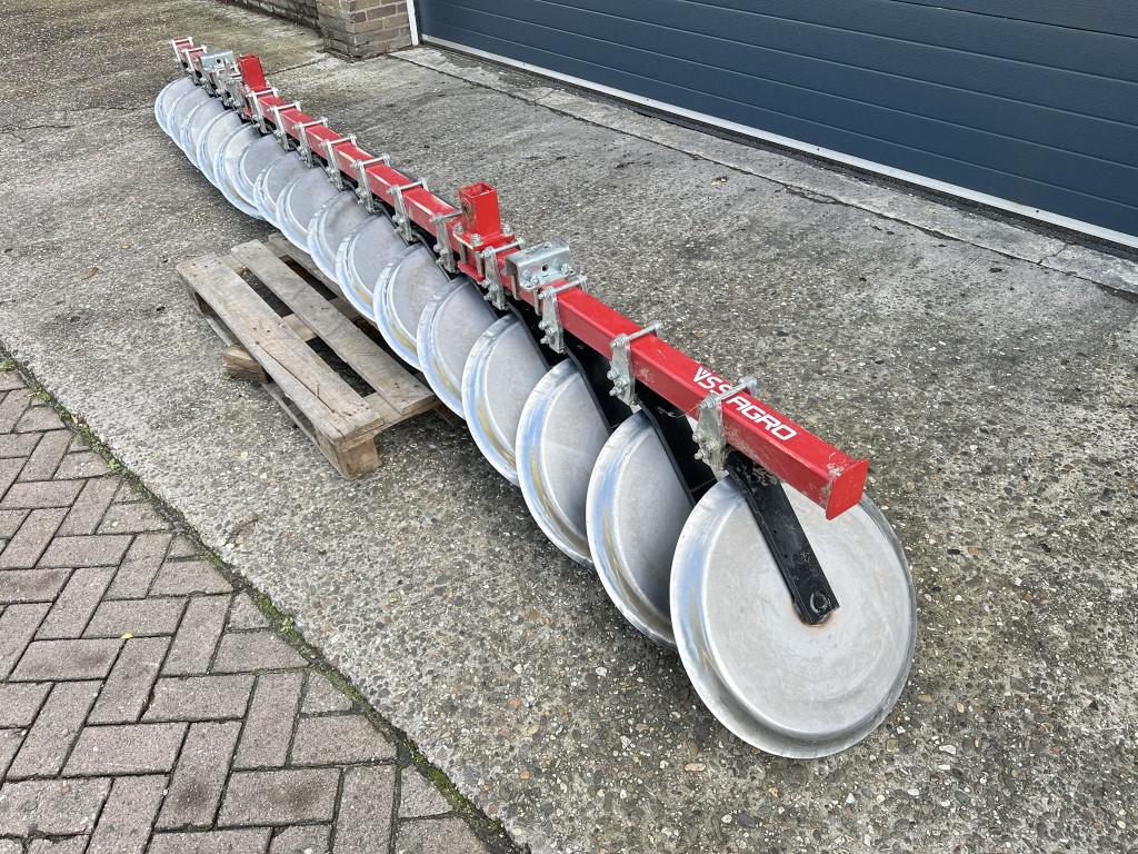 • De ploegvorendrukker bestaat uit twee hydraulische hefarmen, een trekstang en een kokerbalk waaraan zwenkbare dichte holle schijven (Ø560mm) zijn gemonteerd. De schijven zijn kogelgelagerd en gefabriceerd uit slijtvast RVS staal. De machine bevestigt u aan de ploeg met nog te bestellen aanbouwdelen die speciaal passen op de ploeglichamen.